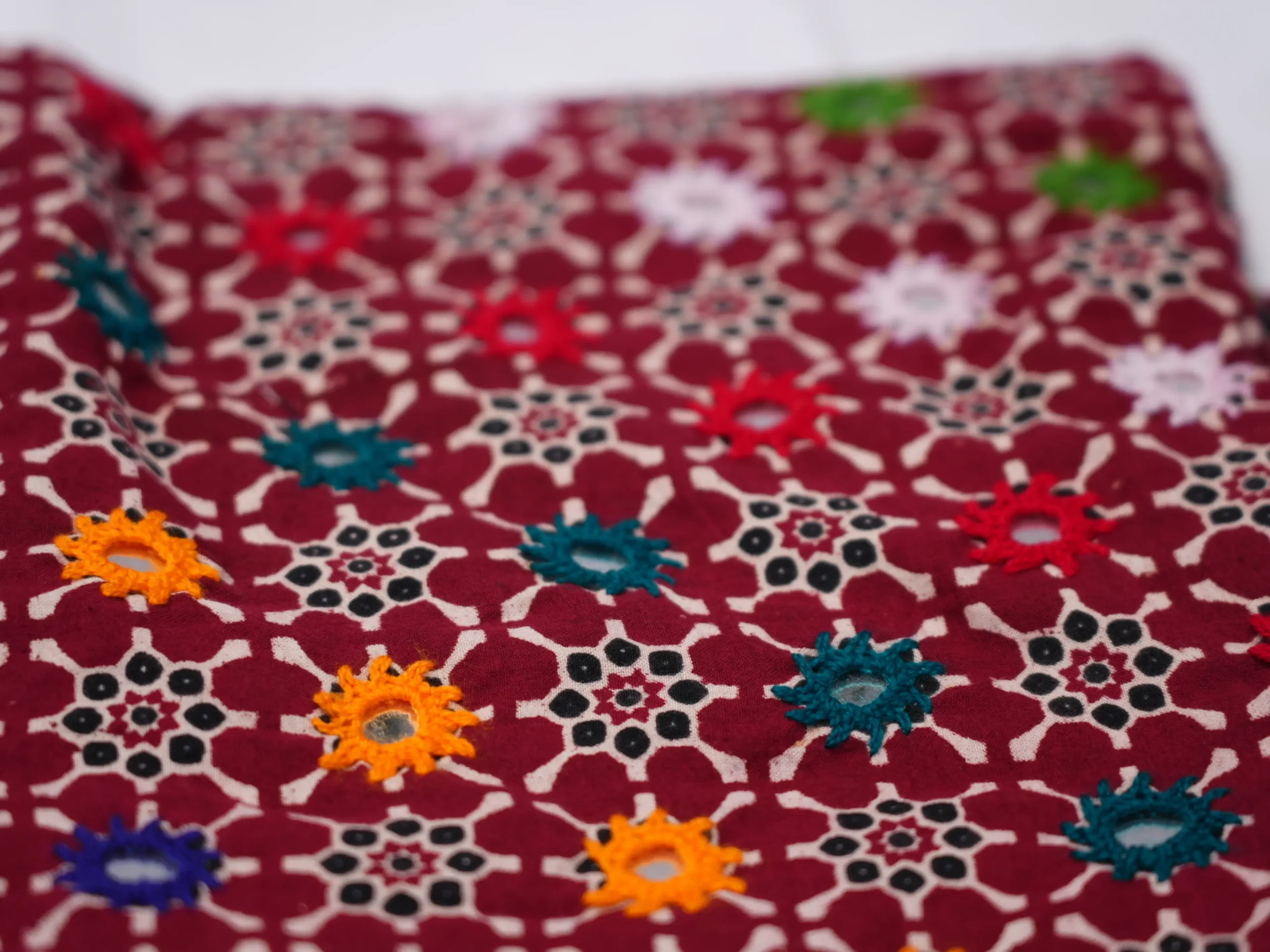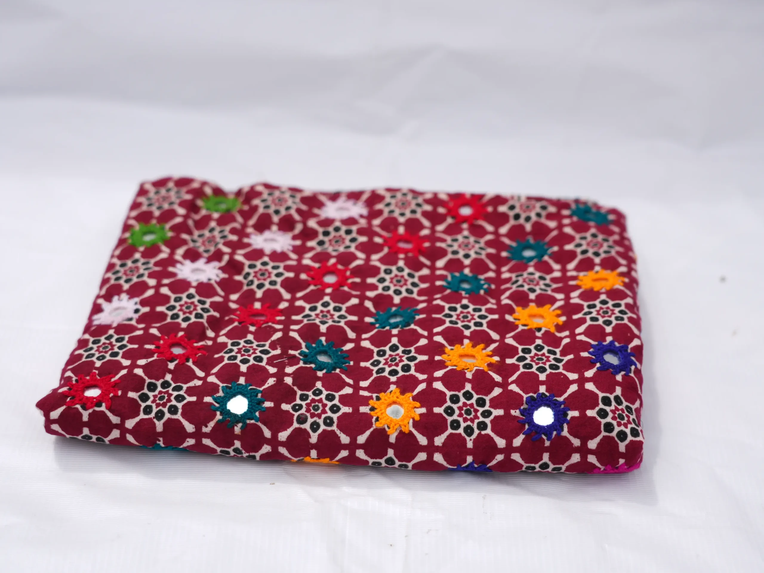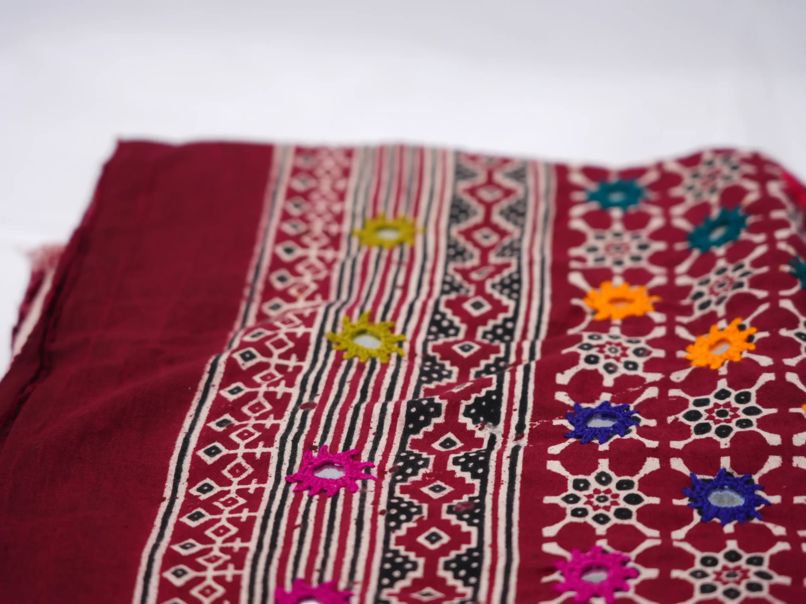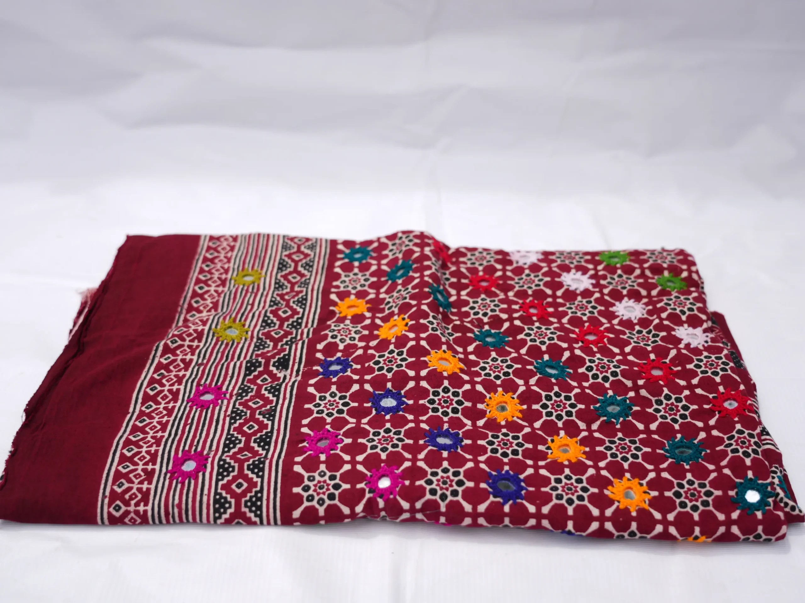 Work: Ajrak shawal | Material: cotton | Color: Base red embriodery multi color with mirror | Declared weight: 150 g